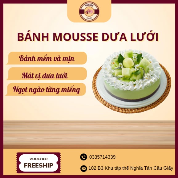 Bánh mousse dưa lưới mát vị mang đến cảm giác tươi mát ngay từ miếng đầu tiên nhờ lớp mousse mềm mịn kết hợp cùng hương dưa lưới tự nhiên. Vị ngọt thanh, béo nhẹ và kết cấu tan trong miệng giúp bánh dễ ăn, không gây ngấy. Đây là lựa chọn lý tưởng cho những ngày cần một món tráng miệng nhẹ nhàng và thư giãn.